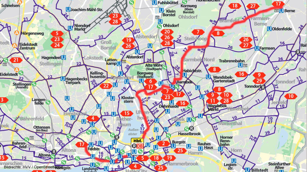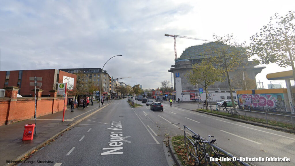 Die Linie 17 geht von der Haltestelle Feldstraße im Karolinenviertel, direkt am Feldstraßenbunker, vorbei am Millerntor-Stadion, quer durch die Hamburger Innenstadt zum Hauptbahnhof, weiter nach Barmbek. Ein Teil der Bus-Einsätze erfolgt erst von hier, bzw. enden in Barmbek.