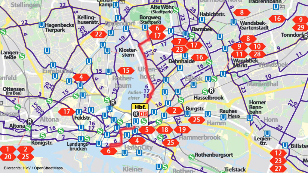 Für die Pausen stehen Haltebuchten am Zollkanal in direkter Nähe zur Verfügung. Vor dort führt der Weg vorbei am Hamburger Hauptbahnhof und der Außenalter in den Stadtteil Winterhude mit seinen alten Häusern bis zur Haltestelle Borgweg, kurz vor dem Hamburger Stadtpark.