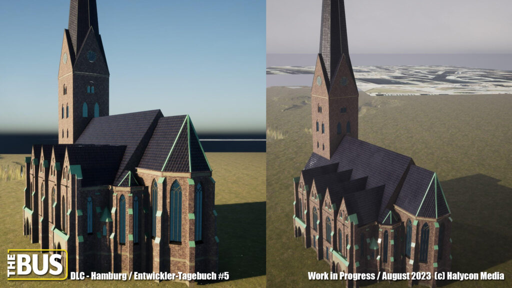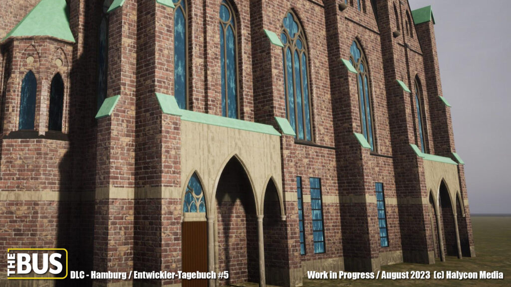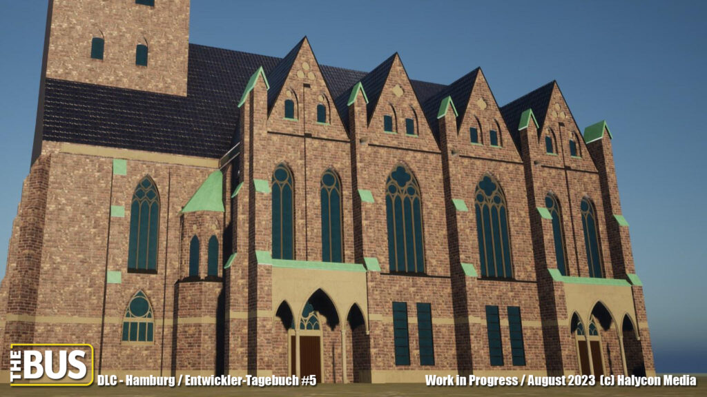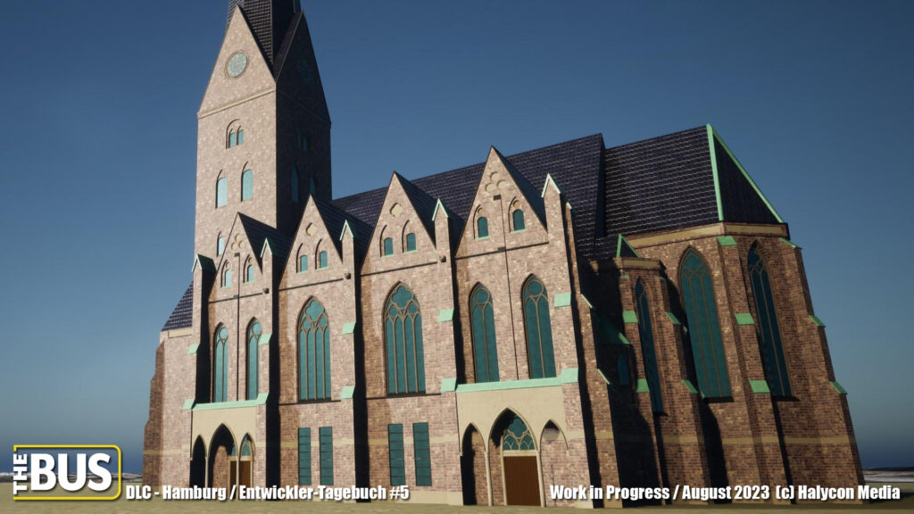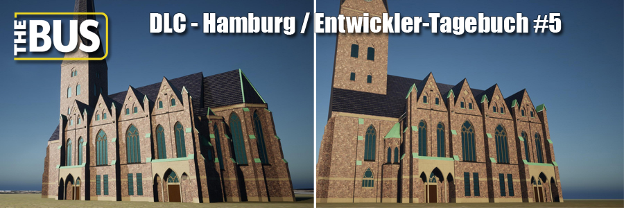 Die Buslinie 6 des in der Entwicklung befindlichen Hamburg-DLCs für The Bus führt auf der Straße Speersort an einer der fünf Hamburger Hauptkirchen vorbei, die Sankt Petri-Kirche.