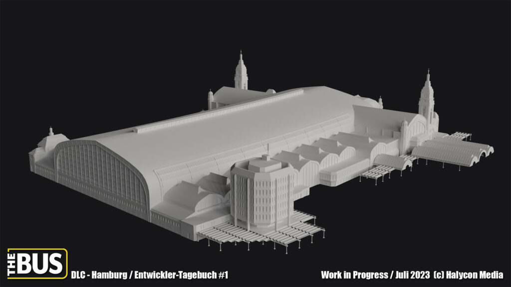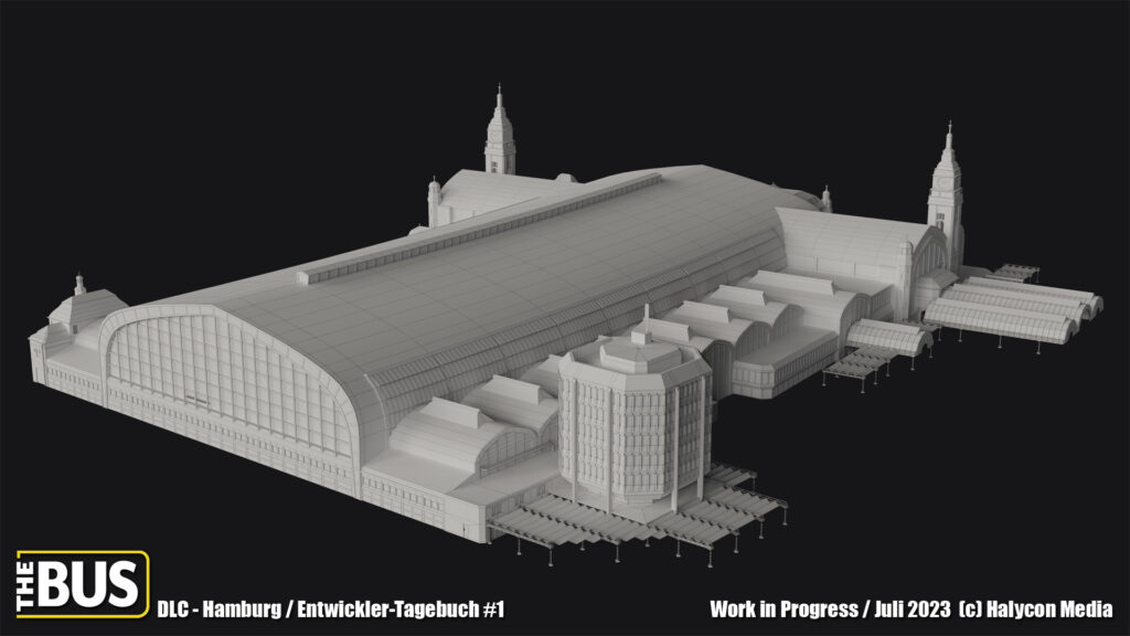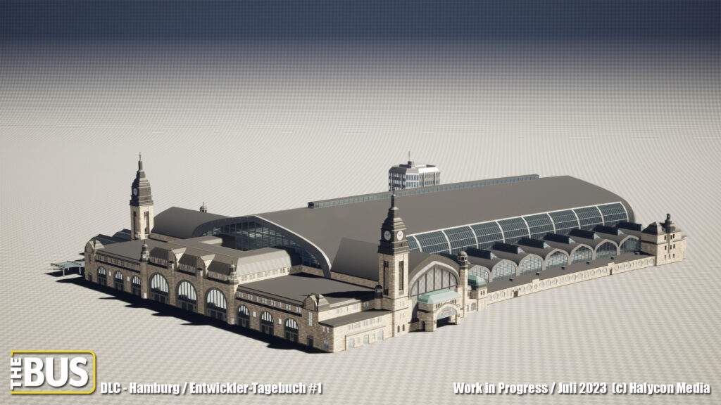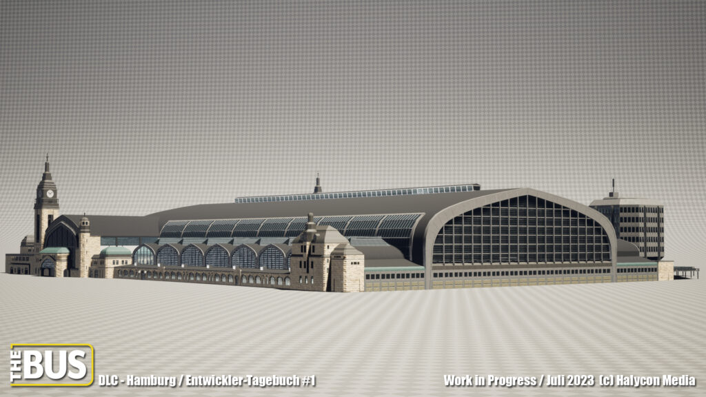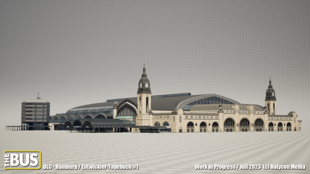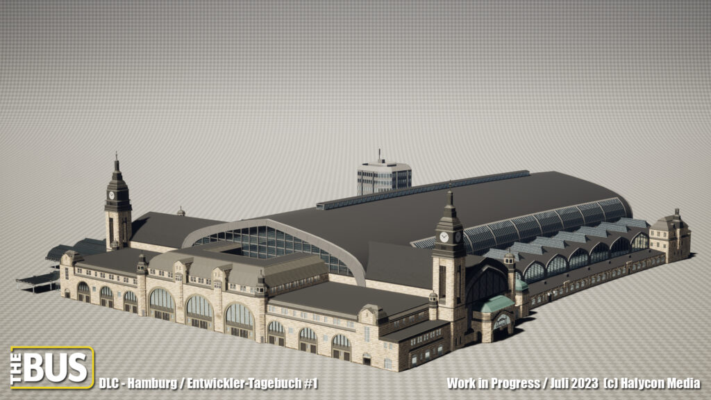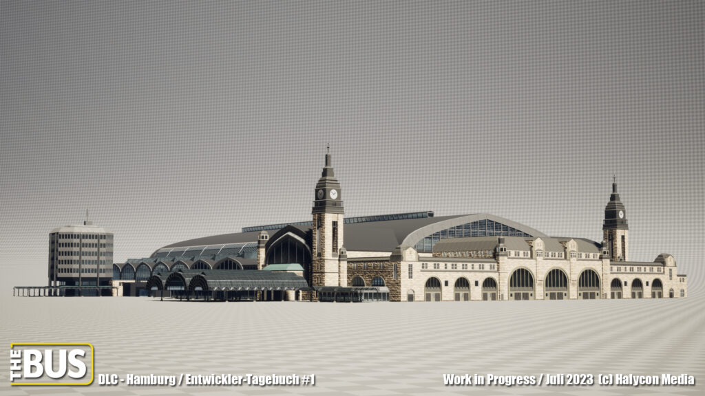 Erst ohne Texturen und Strukturen, nur die oberflächlichen 3D-Strukturen in grau, später dann mit Materialen und Texturen versehen, damit das Gebäude im Spiel möglichst realistisch aussieht. Zum Vergleich einige Originalbilder des heutigen Bahnhofes.